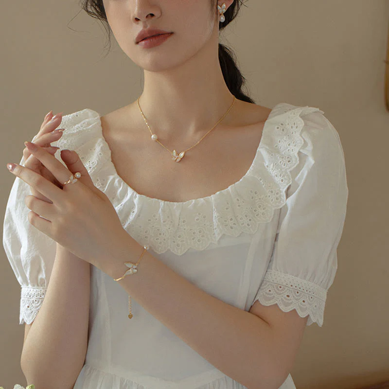 14K Gold Pearl Tridacna Butterfly set embodies blessings and serenity. The lustrous pearls and Tridacna stones are known for their calming properties, while the butterfly design signifies transformation and grace. This beautiful set includes a ring, bracelet, necklace pendant, and earrings, perfect for enriching your spiritual journey and bringing a touch of tranquility to your life.