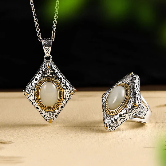 Rhombus Design Jade set features Hetian jade in a unique rhombus design, symbolizing luck and protection. This set includes a necklace pendant and ring, crafted from 925 sterling silver. The Hetian jade promotes tranquility and harmony, while the rhombus design represents stability and balance, making this set ideal for those seeking positive energy and spiritual well-being.