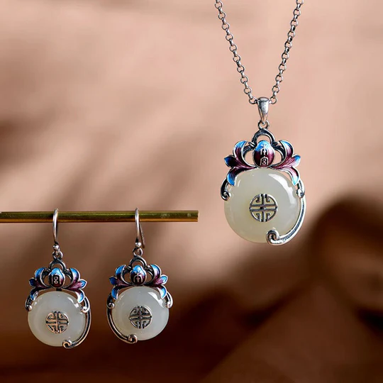 Round Flower Jade set features Hetian jade with delicate flower motifs, symbolizing luck and harmony. This set includes a necklace pendant and earrings, crafted from 925 sterling silver. The natural jade promotes tranquility and balance, while the flower design represents growth and positivity, making this set ideal for those seeking to enhance their spiritual journey with luck and positive energy.