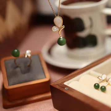Butterfly Tridacna Jade set features natural tridacna stone and cyan jade with butterfly motifs, symbolizing calm and tranquility. This set includes a necklace pendant, ring, and earrings, all copper plated with gold. The tridacna stone promotes peace and serenity, while the cyan jade enhances emotional balance, making this set perfect for those seeking inner calm and spiritual harmony.