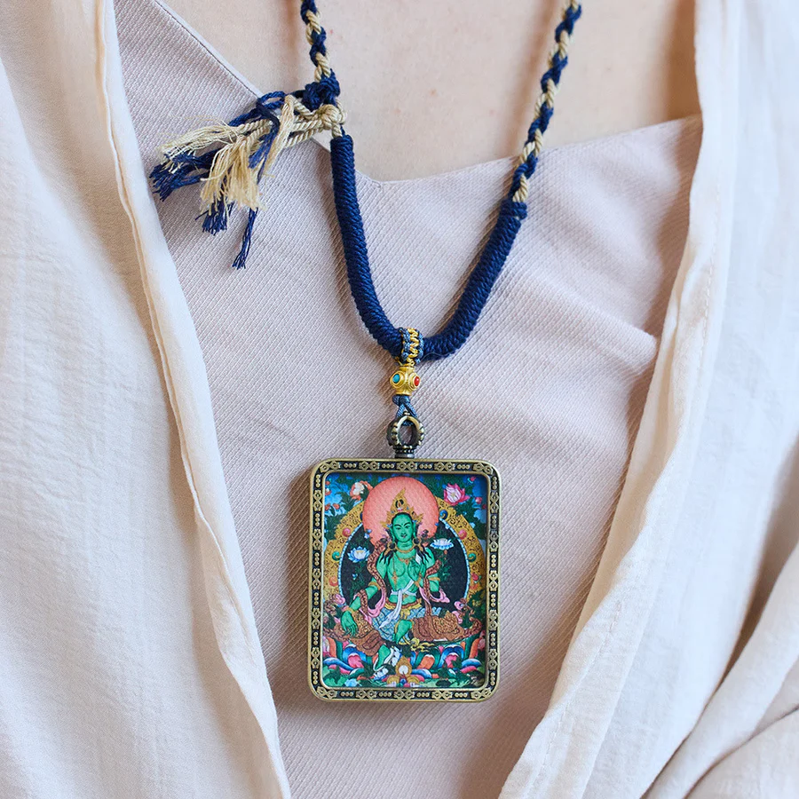 Embark on a journey of hope, calm, and protection with our Tibetan Green Tara Hand-Painted Thangka Buddha Protection Necklace Pendant. Bodhisattva Tara, a symbol of life and hope, offers protection from disasters and evil spirits. Begin your healing journey with sincerity and neatly dressed to harness her unique power.